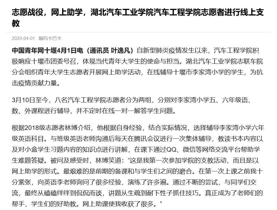 【中国青年网】志愿战役,网上助学,湖北汽车工业学院汽车工程学院志愿者进行线上支教