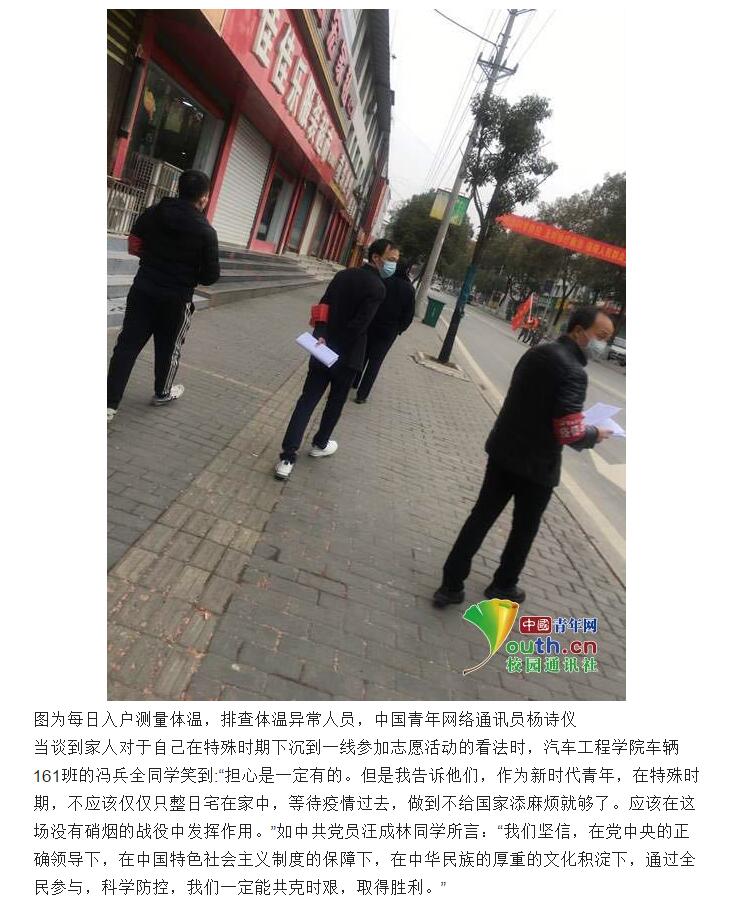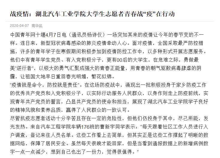 【中国青年网】战疫情:湖北汽车工业学院大学生志愿者青春战“疫”在行动