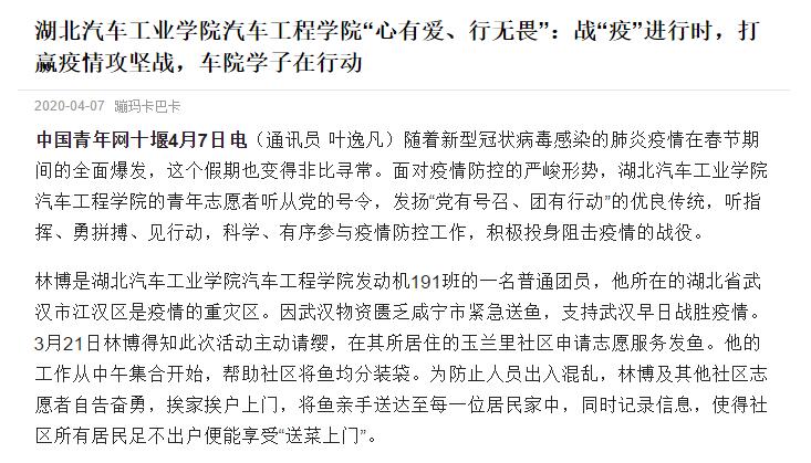 【中国青年网】湖北汽车工业学院汽车工程学院“心有爱、行无畏”:战“疫”进行时,打赢疫情攻坚战,车院学子在行动