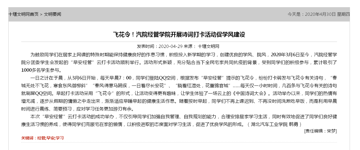 【十堰文明网】飞花令!汽院经管学院开展诗词打卡活动促学风建设
