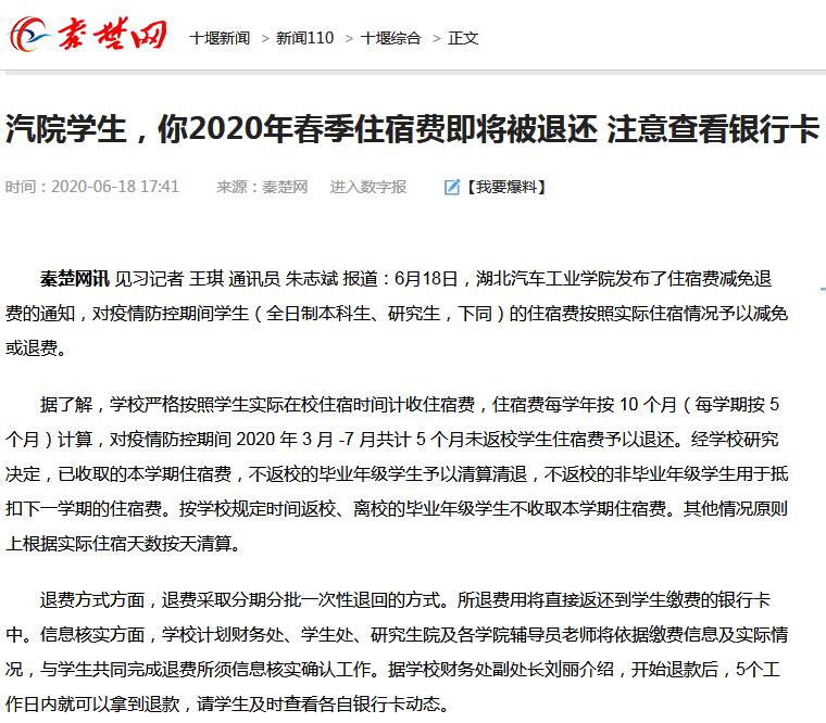 【秦楚网】汽院学生,你2020年春季住宿费即将被退还 注意查看银行卡