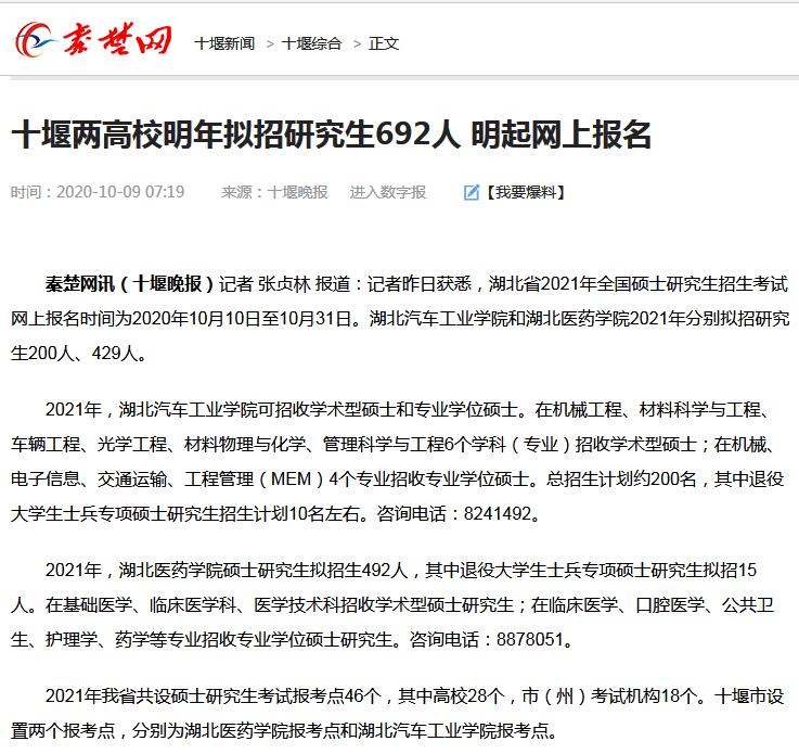 【秦楚网】湖北汽车工业学院2021年拟招研究生200人,明起网上报名