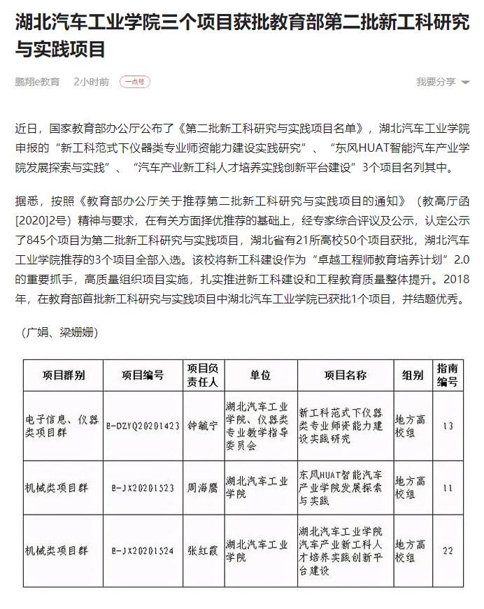 【一点资讯】湖北汽车工业学院三个项目获批教育部第二批新工科研究与实践项目