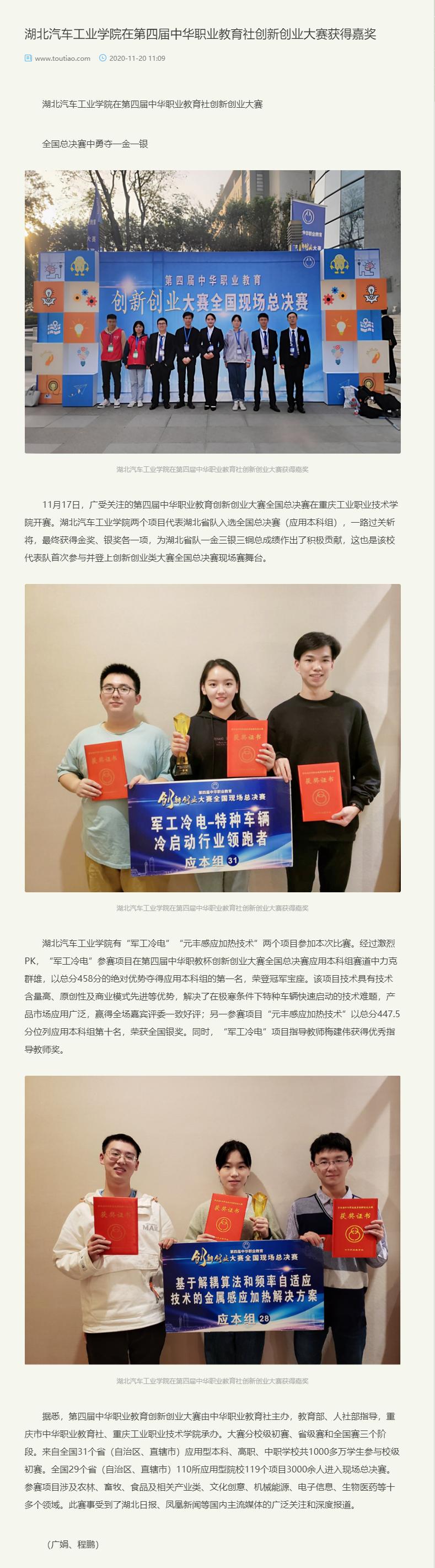 【今日头条】湖北汽车工业学院在第四届中华职业教育社创新创业大赛获得嘉奖