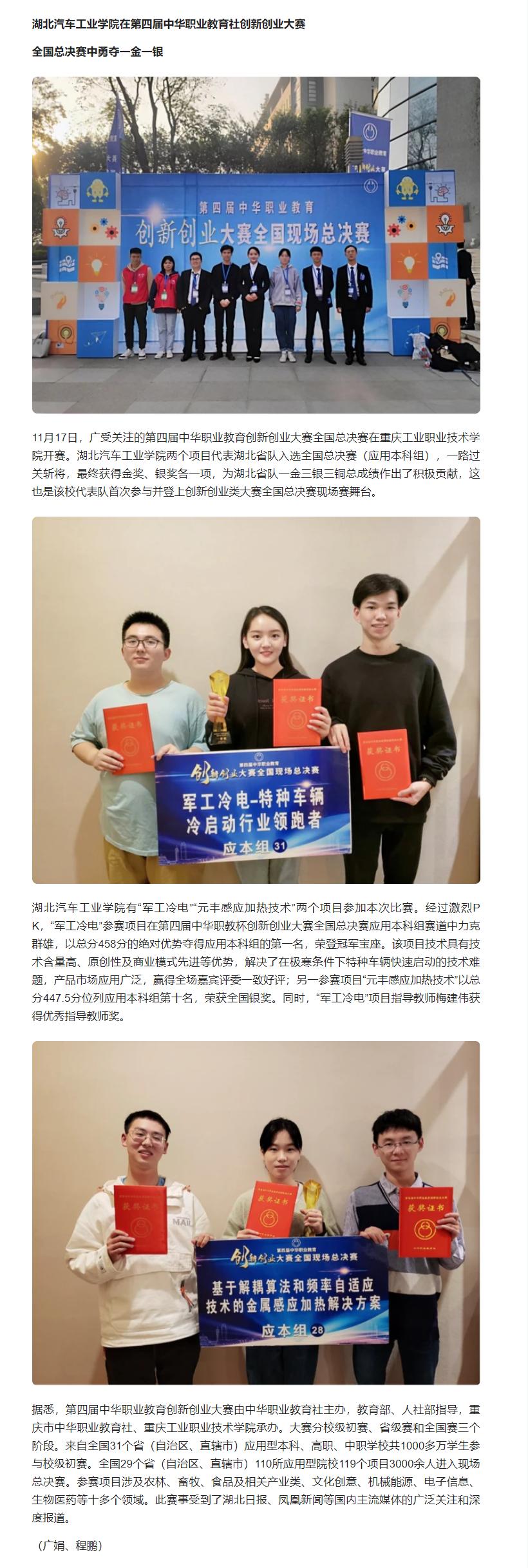 【腾讯】湖北汽车工业学院在第四届中华职业教育社创新创业大赛全国总决赛中勇夺一金一银