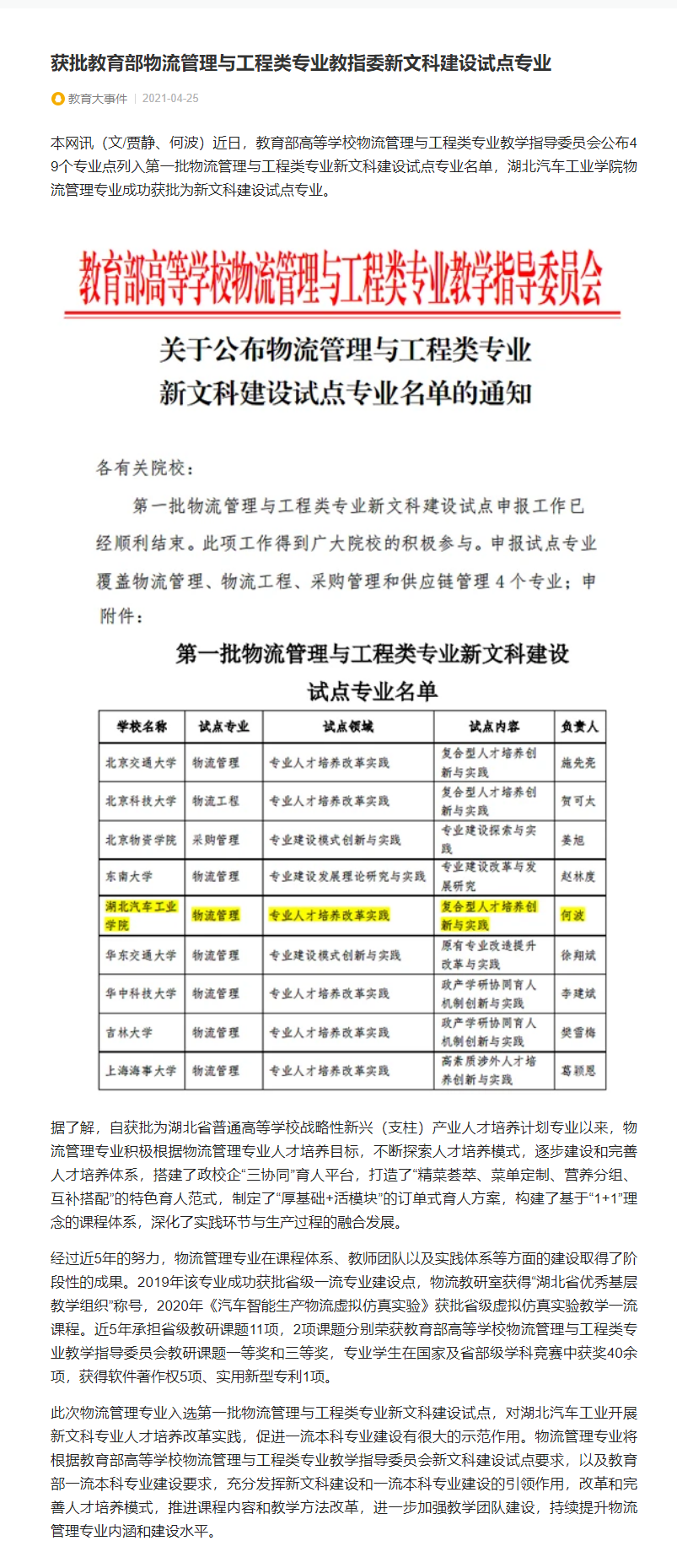 【腾讯网】湖北汽车工业学院获批教育部物流管理与工程类专业教指委新文科建设试点专业