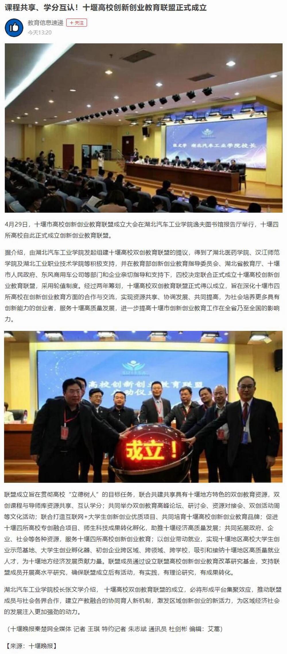 【教育信息速递】课程共享、学分互认!十堰高校创新创业教育联盟正式成立