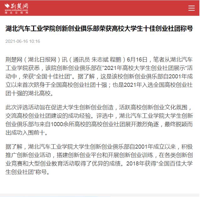 【荆楚网】湖北汽车工业学院创新创业俱乐部荣获高校大学生十佳创业社团称号