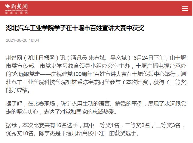 【荆楚网】湖北汽车工业学院学子在十堰市百姓宣讲大赛中获奖