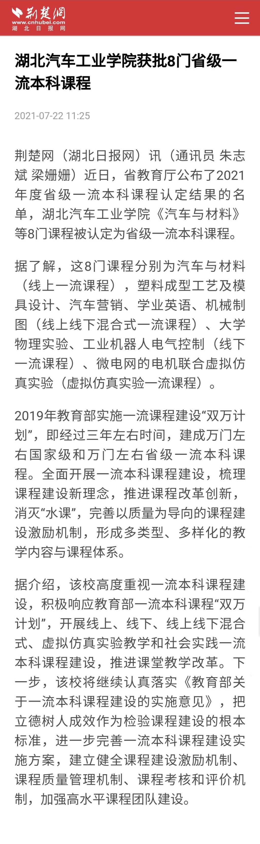 【荆楚网】湖北汽车工业学院获批8门省级一流本科课程