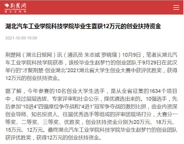 【荆楚网】湖北汽车工业学院科技学院毕业生喜获12万元的创业扶持资金