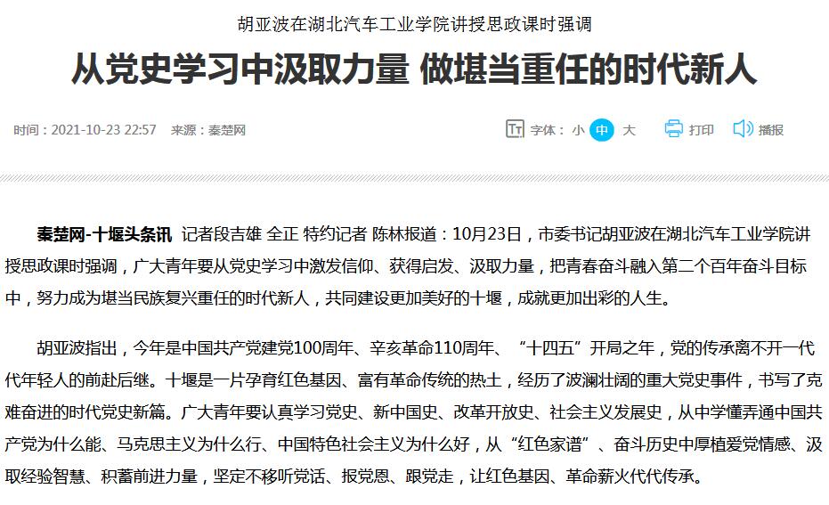 【秦楚网】胡亚波在湖北汽车工业学院讲授思政课时强调 从党史学习中汲取力量 做堪当重任的时代新人