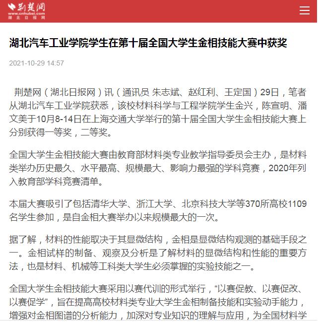 【荆楚网】湖北汽车工业学院学生在第十届全国大学生金相技能大赛中获奖