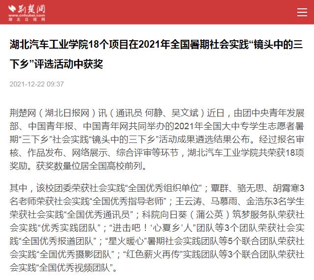【荆楚网】湖北汽车工业学院18个项目在2021年全国暑期社会实践“镜头中的三下乡”评选活动中获奖