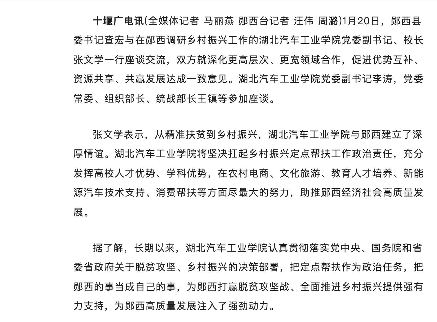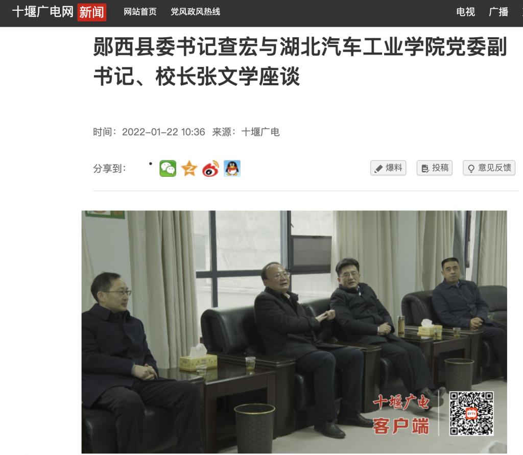 【十堰广电网】郧西县委书记查宏与湖北汽车工业学院党委副书记、校长张文学座谈