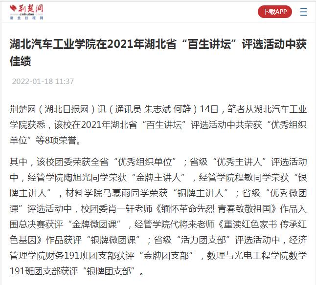 【荆楚网】湖北汽车工业学院在2021年湖北省“百生讲坛”评选活动中获佳绩