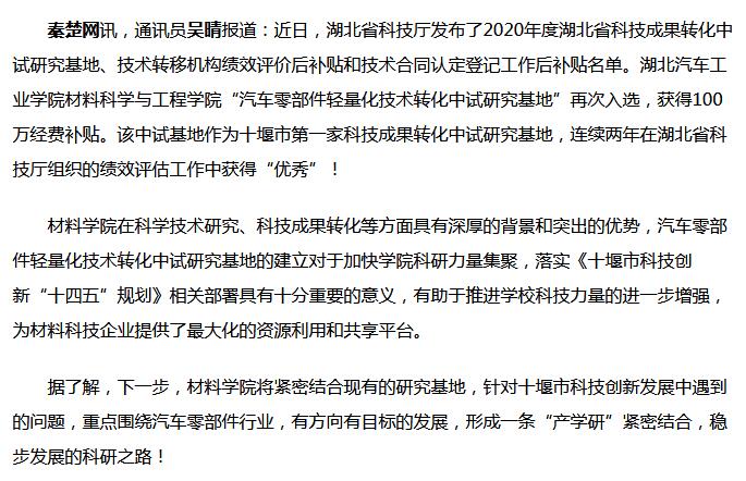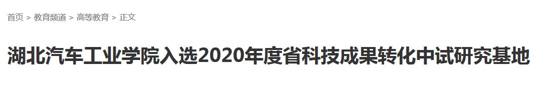 【秦楚网】湖北汽车工业学院入选2020年度省科技成果转化中试研究基地