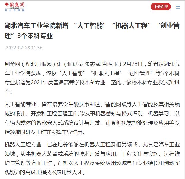 【荆楚网】湖北汽车工业学院新增 “人工智能”“机器人工程”“创业管理”3个本科专业