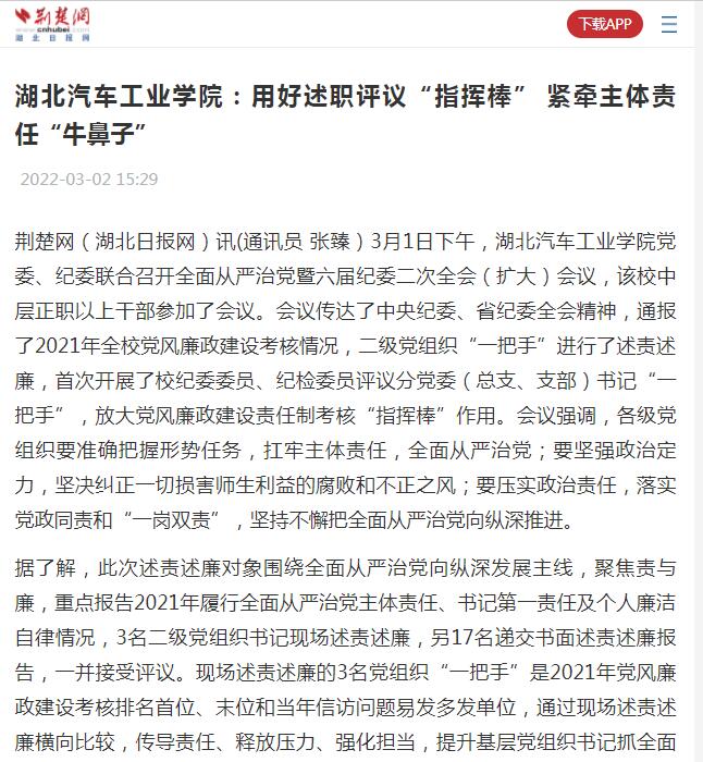 【荆楚网】湖北汽车工业学院:用好述职评议“指挥棒” 紧牵主体责任“牛鼻子”