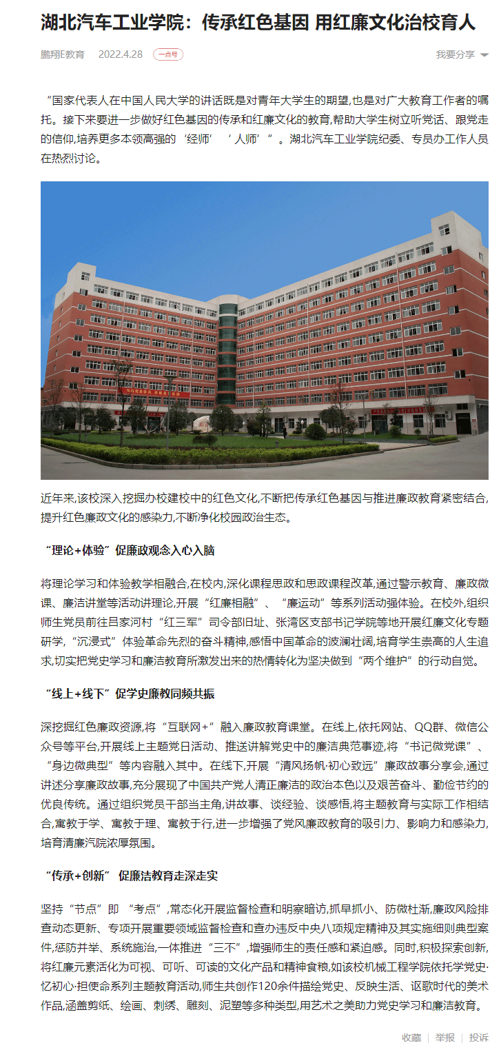 【一点资讯】湖北汽车工业学院:传承红色基因 用红廉文化治校育人