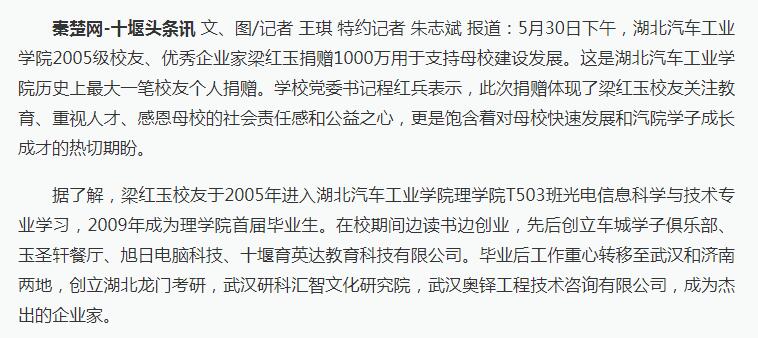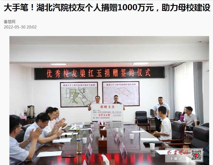 【秦楚网】大手笔!湖北汽院校友个人捐赠1000万元,助力母校建设