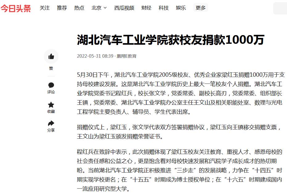 【今日头条】湖北汽车工业学院获校友捐款1000万