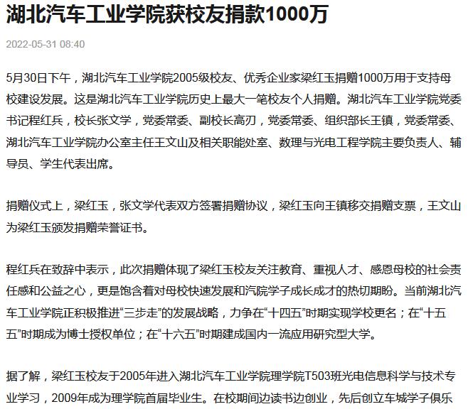 【搜狐网】湖北汽车工业学院获校友捐款1000万