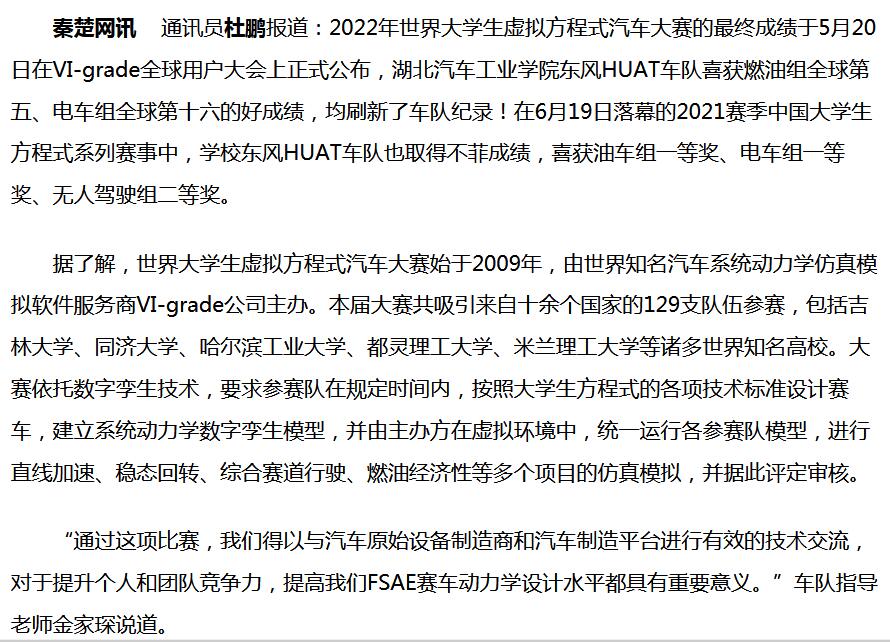 【秦楚网】全球第五!汽院东风HUAT车队再刷新纪录
