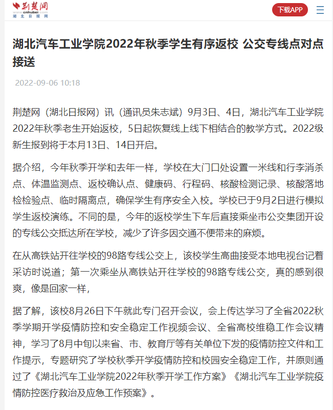 【荆楚网】湖北汽车工业学院2022年秋季学生有序返校 公交专线点对点接送