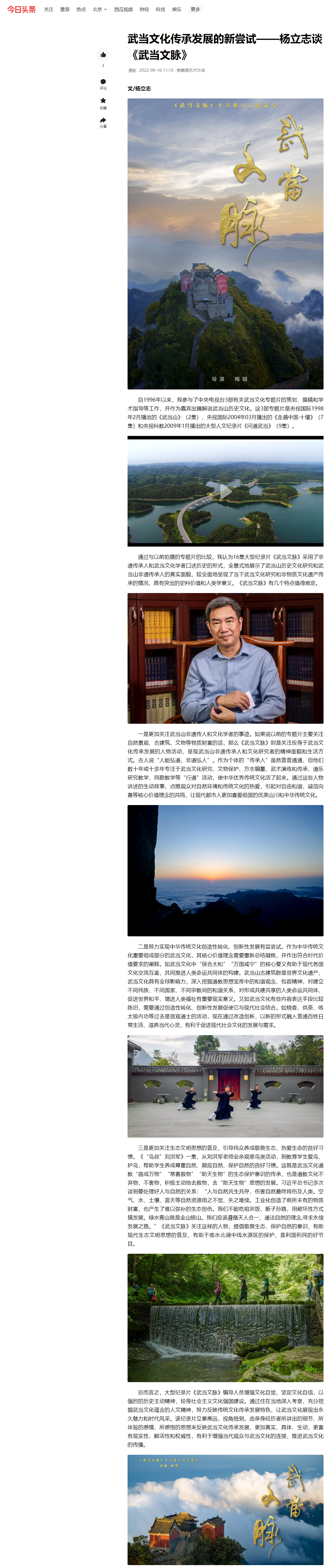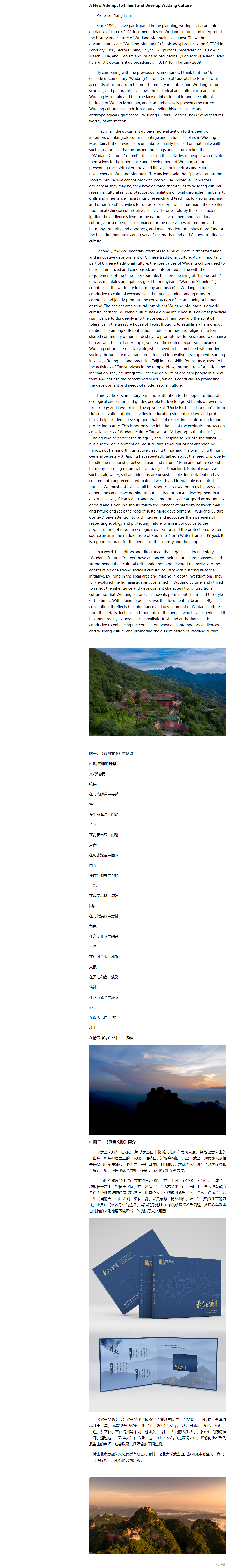 据悉,《武当文脉》纪录片通过深入考察,充分挖掘武当文化蕴含的人文精神,努力反映传统文化传承发展特色,让武当文化展现出永久魅力和时代风采。该纪录片立意高远,视角独到,由亲身经历者所讲出的细节、所体验的感情、所感悟的思想来反映武当文化传承发展,更加真实、具体、生动,更富有现实性、鲜活性和权威性,有利于增强当代观众与武当文化的连接,推进武当文化的传播。