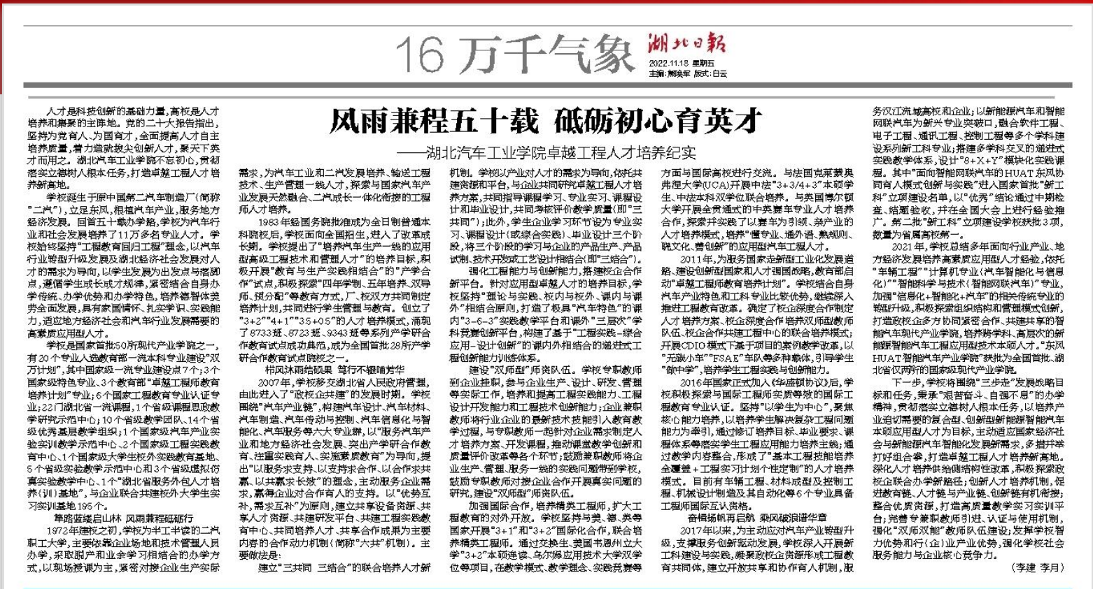 人才是科技创新的基础力量,高校是人才培养和集聚的主阵地。党的二十大报告指出,坚持为党育人、为国育才,全面提高人才自主培养质量,着力造就拔尖创新人才,聚天下英才而用之。湖北汽车工业学院不忘初心,贯彻落实立德树人根本任务,打造卓越工程人才培养新高地。
