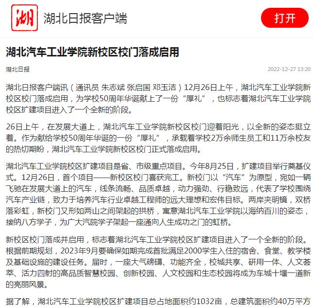 【湖北日报】湖北汽车工业学院新校区校门落成启用