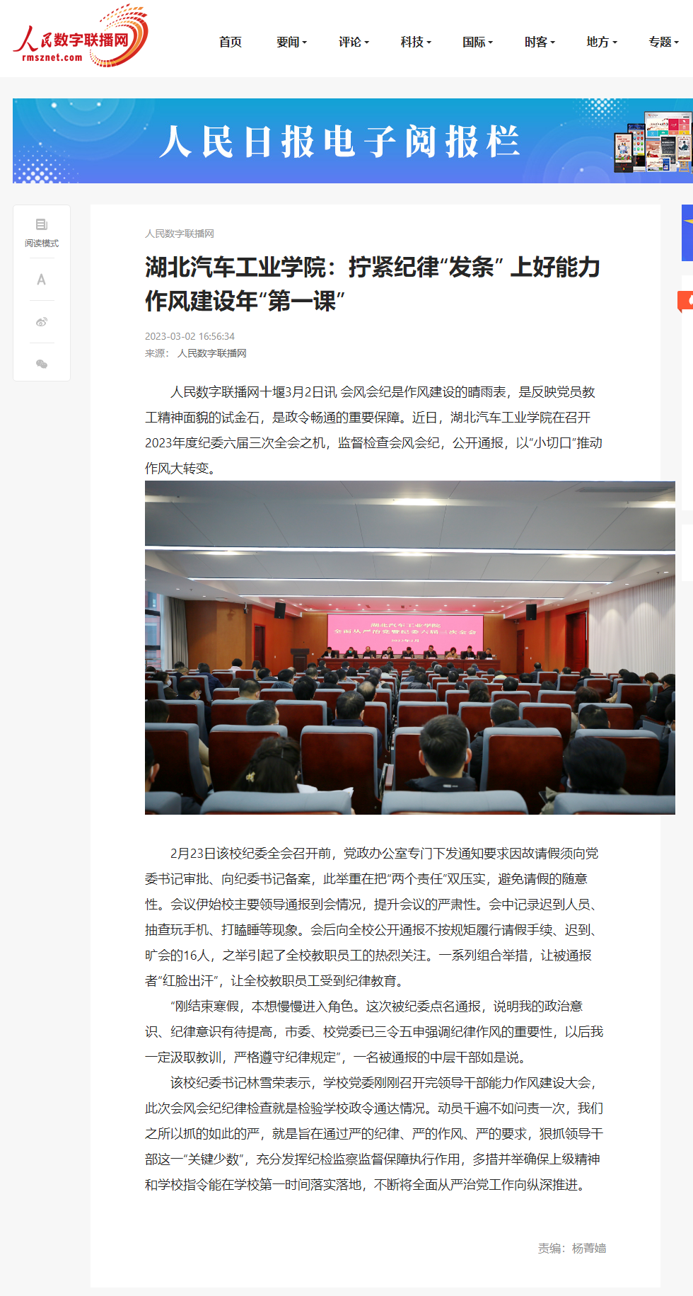 【人民日报数字联播】湖北汽车工业学院:拧紧纪律“发条” 上好能力作风建设年“第一课”