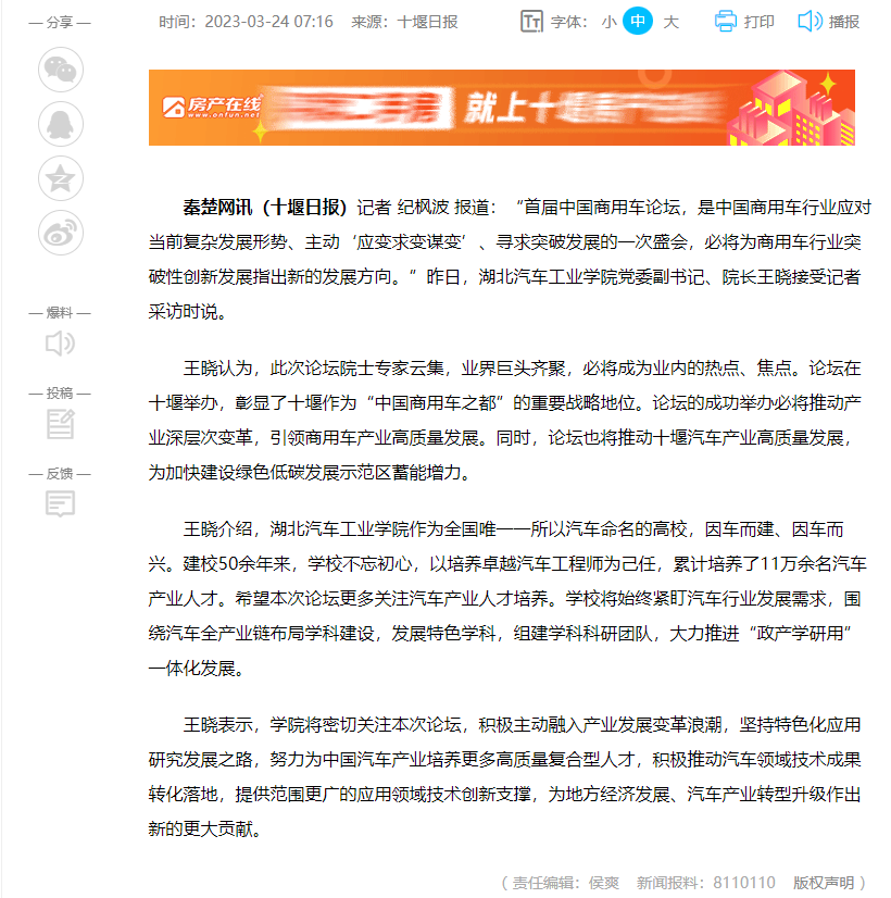 【秦楚网】首届中国商用车论坛 | 湖北汽车工业学院党委副书记、院长王晓:希望论坛更多关注产业人才培养