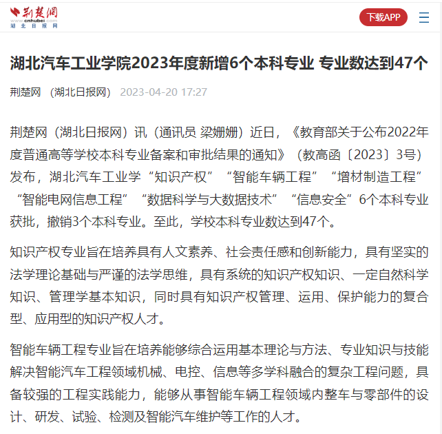 【荆楚网】湖北汽车工业学院2023年度新增6个本科专业 专业数达到47个