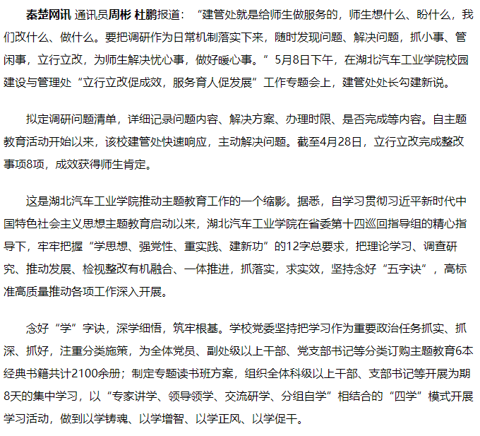 【秦楚网】湖北汽院:高标准高质量推动主题教育工作