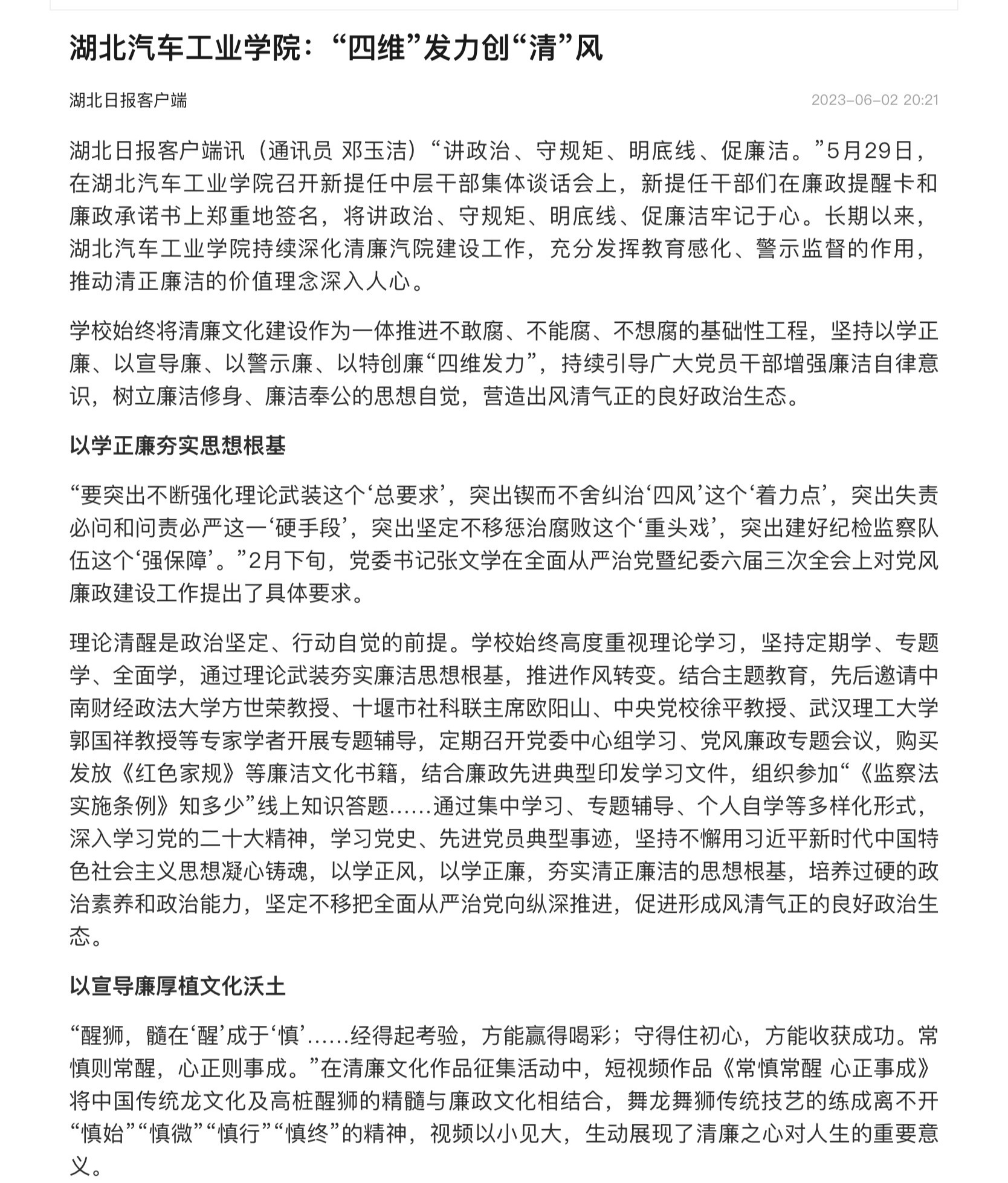 【湖北日报】湖北汽车工业学院:“四维”发力创“清”风
