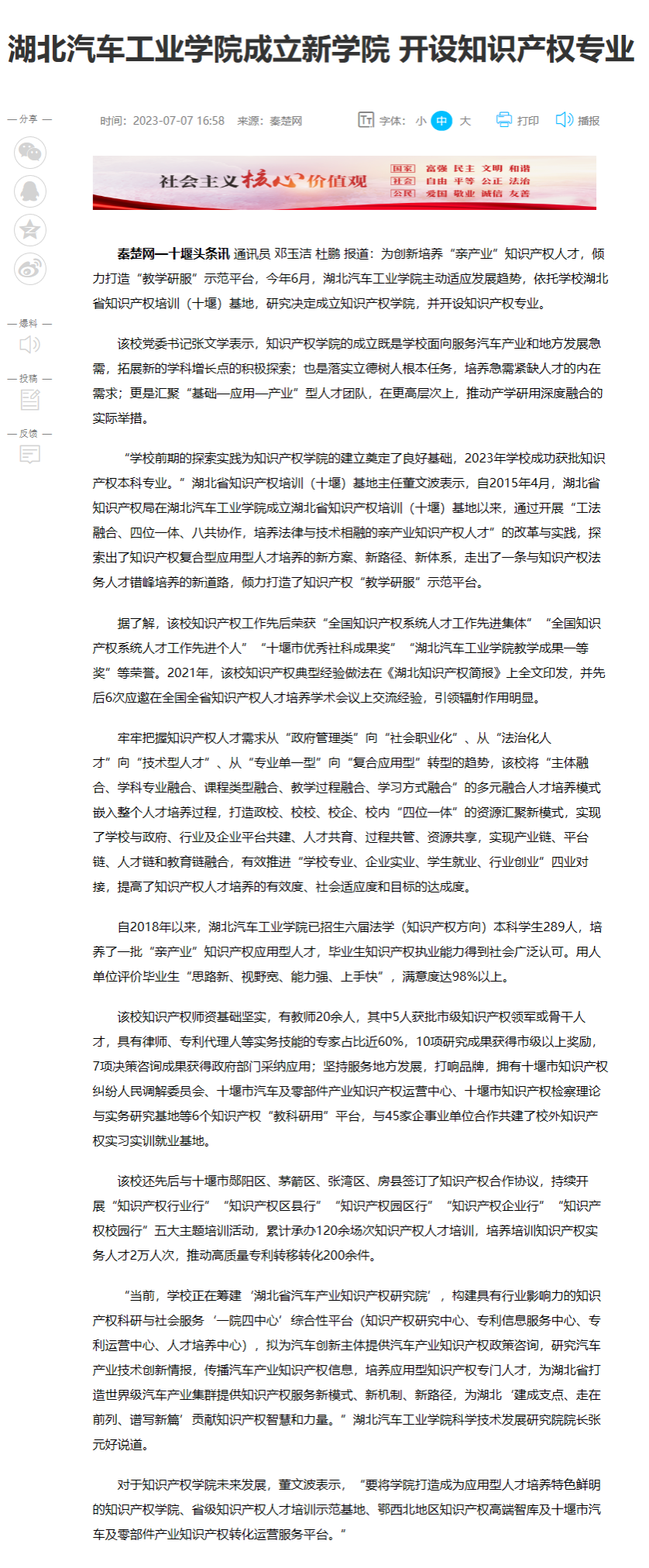 【秦楚网】湖北汽车工业学院成立新学院 开设知识产权专业