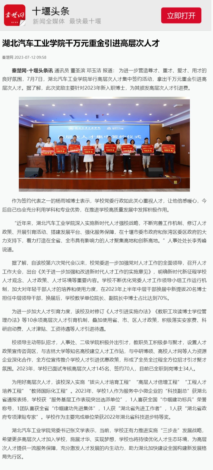 【秦楚网】湖北汽车工业学院千万元重金引进高层次人才