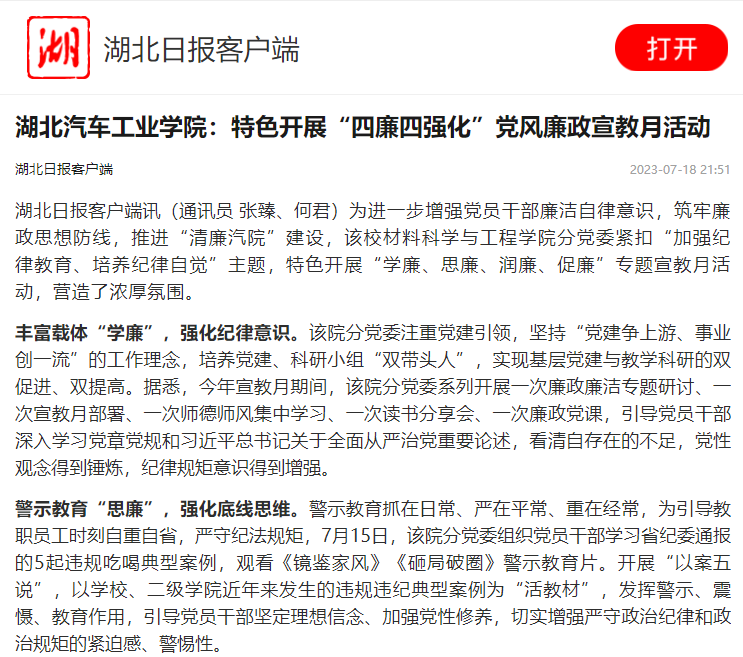 【湖北日报】湖北汽车工业学院:特色开展“四廉四强化”党风廉政宣教月活动