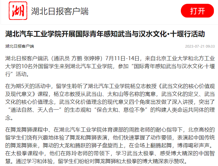 【湖北日报】湖北汽车工业学院开展国际青年感知武当与汉水文化·十堰行活动
