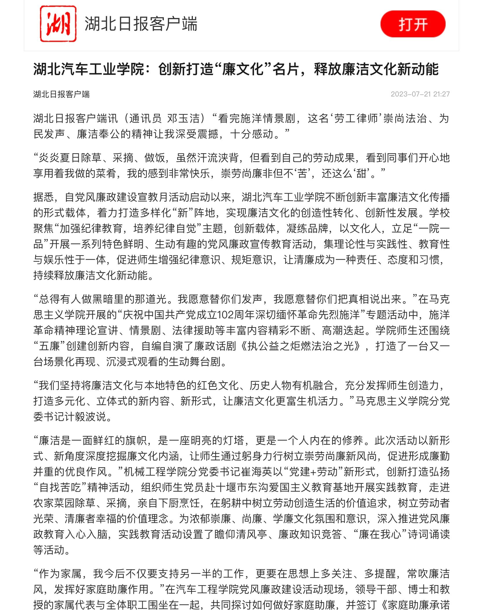 【湖北日报】湖北汽车工业学院:创新打造“廉文化”名片,释放廉洁文化新动能