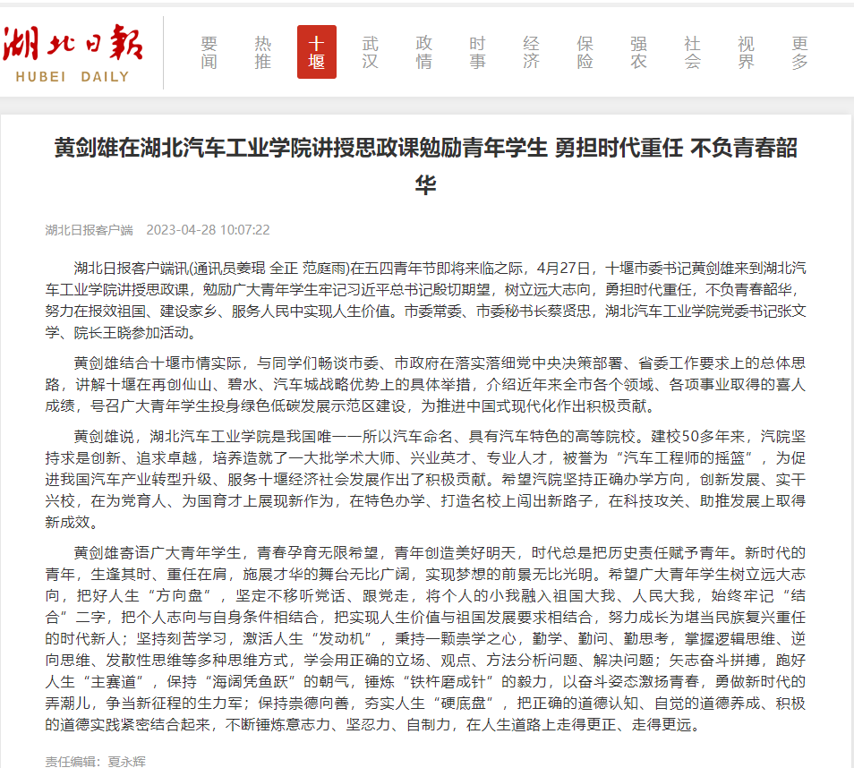 【湖北日报】黄剑雄在湖北汽车工业学院讲授思政课勉励青年学生 勇担时代重任 不负青春韶华