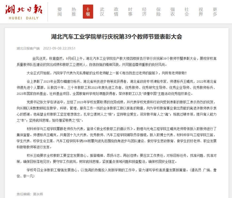 【湖北日报】湖北汽车工业学院举行庆祝第39个教师节表彰大会