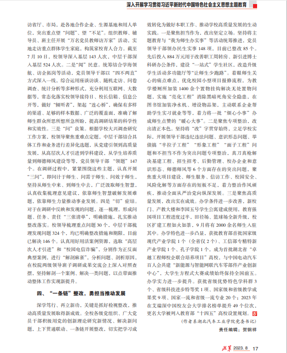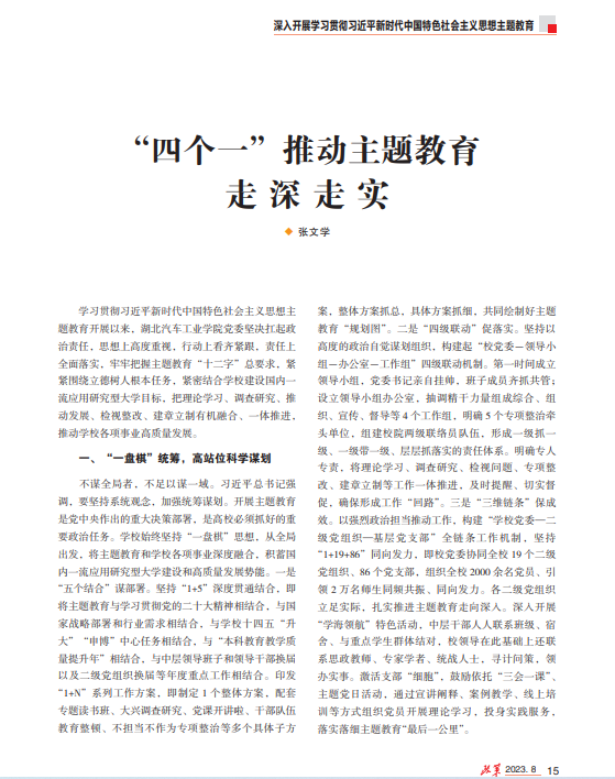 近日,由中共湖北省委主办的《政策》杂志2023年第8期刊发了我校党委书记张文学同志文章:《“四个一”推动主题教育走深走实》。
