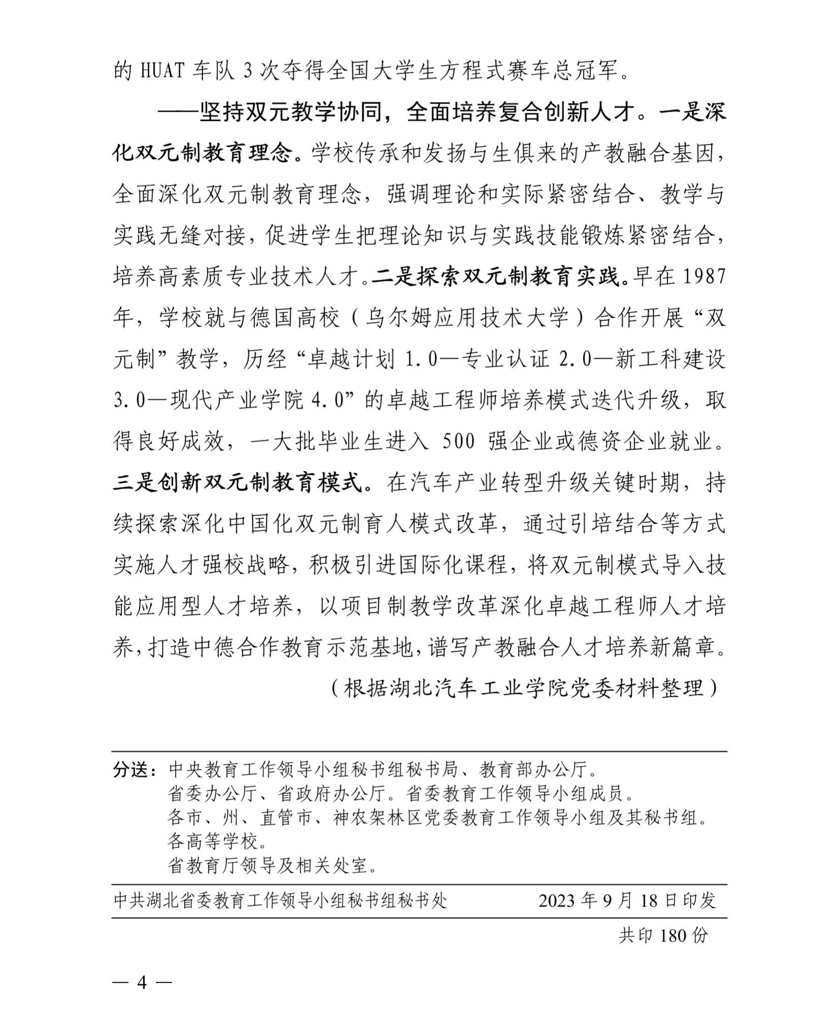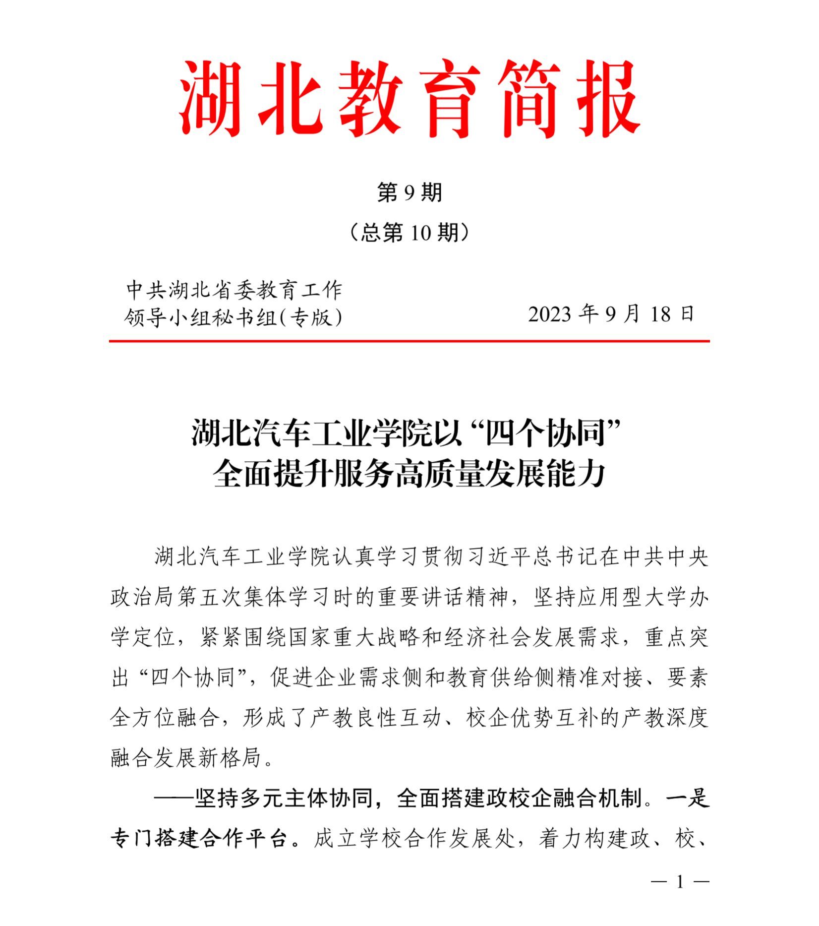 近日,由中共湖北省委教育工作领导小组主办的《湖北教育简报》2023年第9期刊发了题为《湖北汽车工业学院以“四个协同”全面提升服务高质量发展能力》文章。