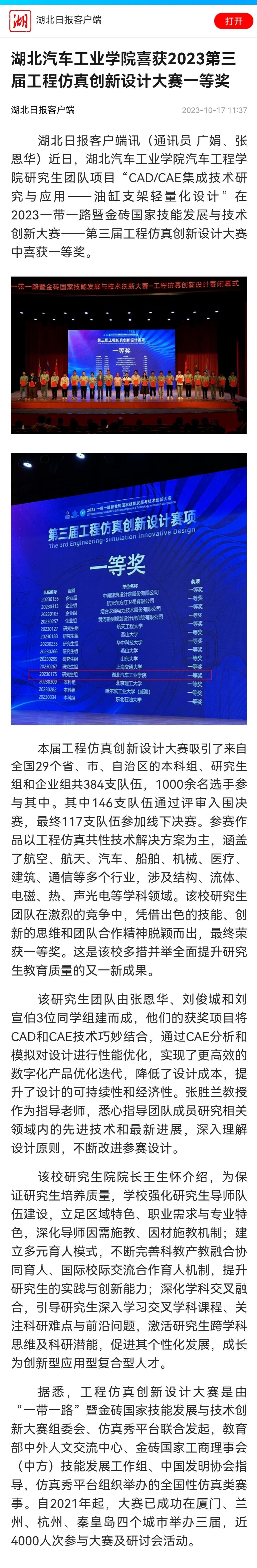 【湖北日报】湖北汽车工业学院喜获2023第三届工程仿真创新设计大赛一等奖