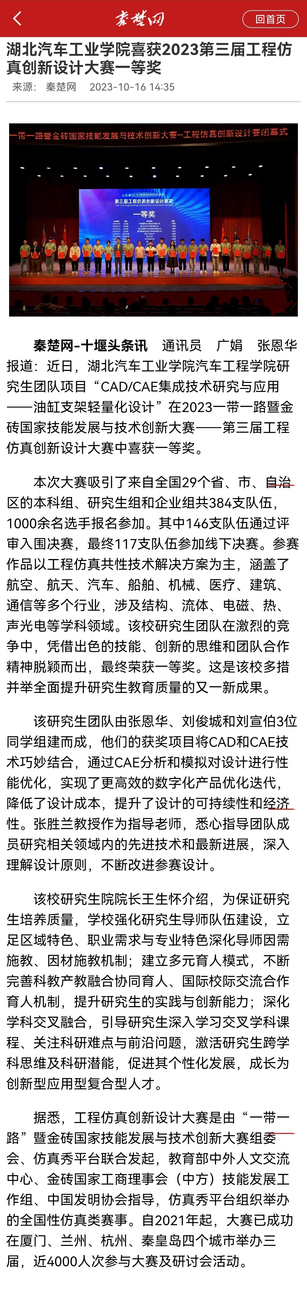 【秦楚网】湖北汽车工业学院喜获2023第三届工程仿真创新设计大赛一等奖