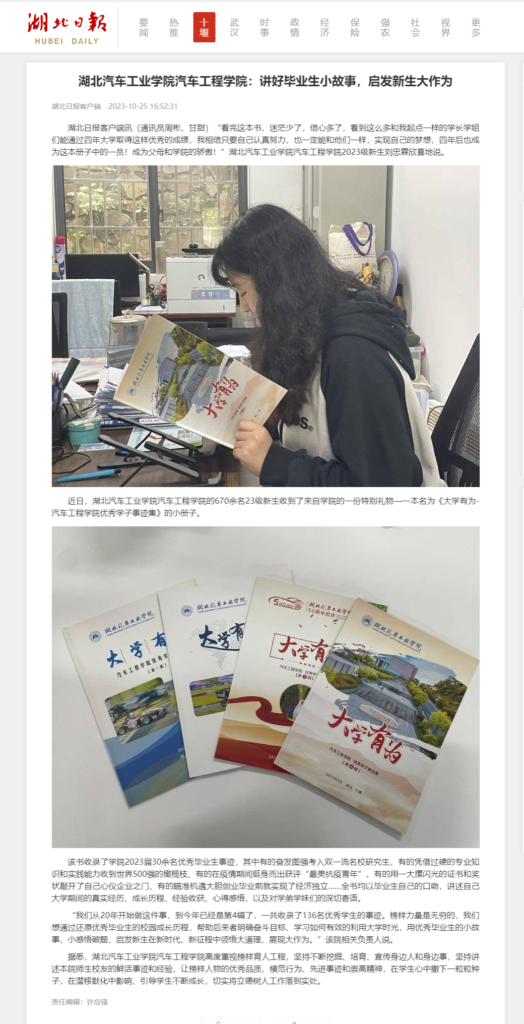 【湖北日报】湖北汽车工业学院汽车工程学院:讲好毕业生小故事,启发新生大作为
