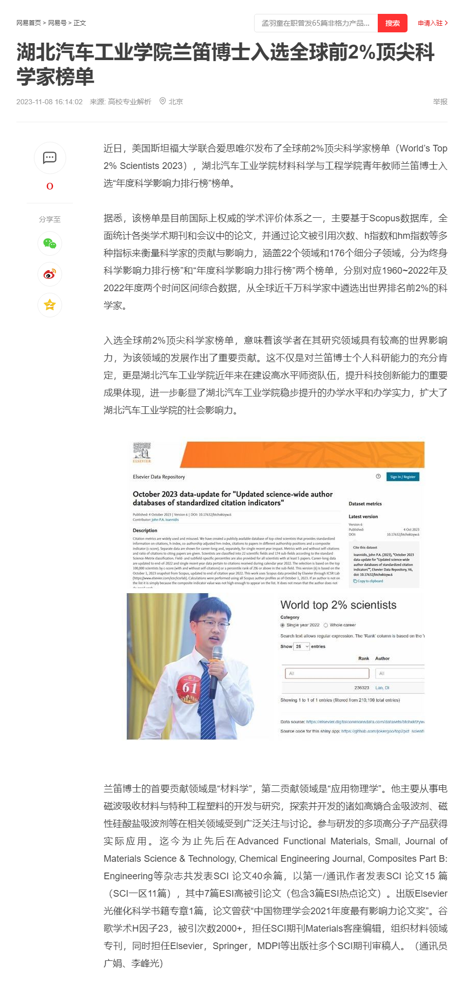 【网易】湖北汽车工业学院兰笛博士入选全球前2%顶尖科学家榜单